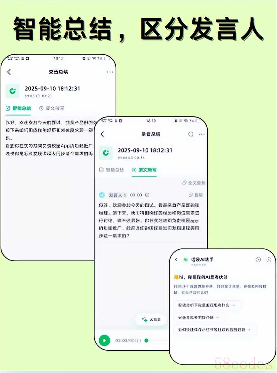 一开始我以为话袋就是个普通的录音工具,直到第一次用它记部门周会,才发现它的厉害。打开 APP 点击 “录音总结”,手机就开始自动录音,更神奇的是,屏幕上还实时显示着转写的文字 —— 领导说 “下周三前提交方案”,文字立马同步出现,连 “责任人:小张” 都标得清清楚楚。