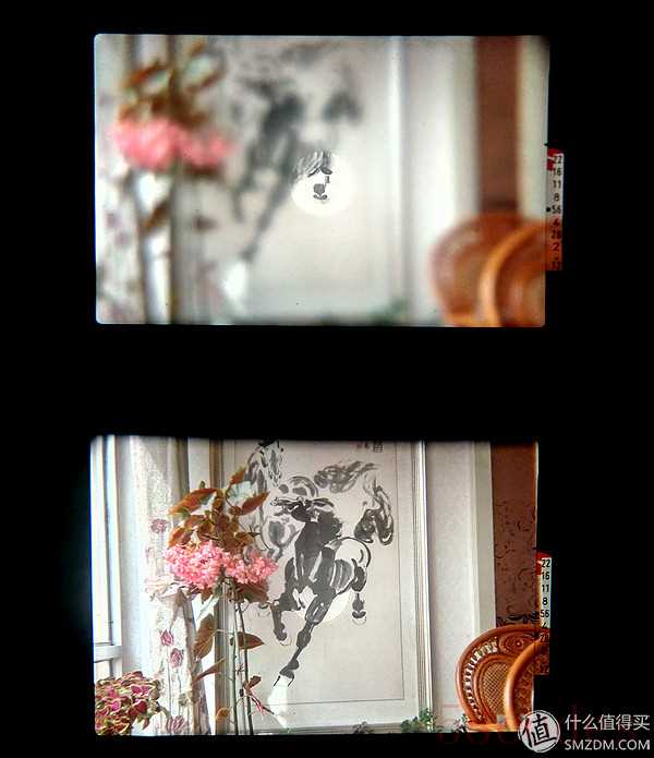 ▲对焦方面,AE-1采用的是裂像屏对焦,一般来说,裂像对焦屏就是一块磨砂屏幕中间放上一个透明的,一分为二的光亮圆形。当圆形中的上下影像并合起来,就算是把目标对准了,上图可以看到,对焦完成后,取景器里的画面会变清晰,然后分成两半的影像就完全拼合起来了。