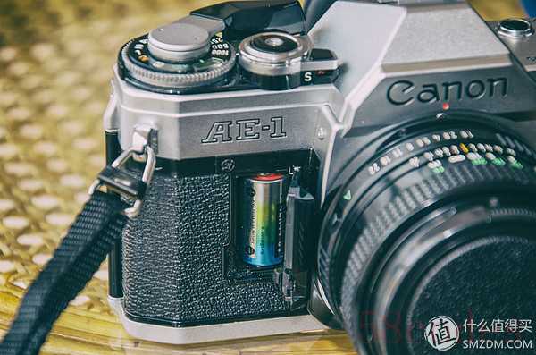 机身右测是AE-1的电池仓,这颗电池是用于给相机的测光系统供电的,实际使用中消耗不大,不需要常常更换,但是由于这种型号的电池一般超市没有卖,所以如果需要,可以寻求万能的淘宝,一次多买几颗。