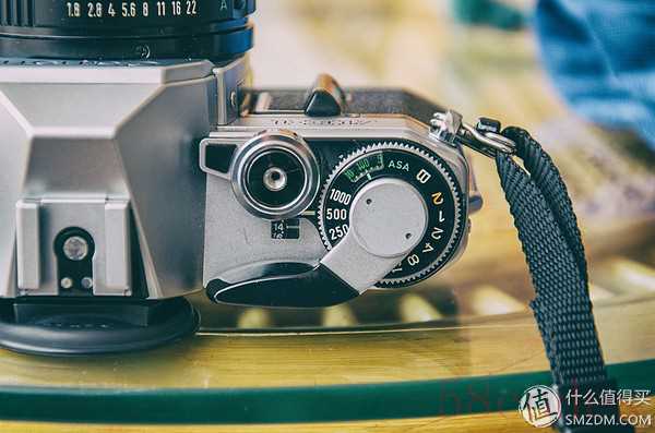 转盘整体材质是塑料,手感不及金属但是还算舒服,快门可调范围是1/1000s-2s,外加B门,转盘上边那个绿色的部分是用来调整ISO的,和数码机不同,胶片机ISO是根据胶卷ISO来调整的,机内测光机构会根据设置的ISO和快门速度给出合适的光圈值。转盘旁边显示数字的部分是底片计数器,用来提示已经拍摄的底片数。