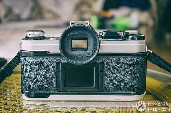 在机身的背面,和现在的数码单反一样,首先是取景器,外部有一个橡胶眼罩,取景还是通过五棱镜将镜头的光线折射出来,所见即所得。取景器下方,取代数码机显示屏的就是胶卷仓了,上提回片器就可以打开,在安装胶卷的时候应该注意避光,然后注意一定要把胶卷卷上去,不然拍照的时候会出现问题。