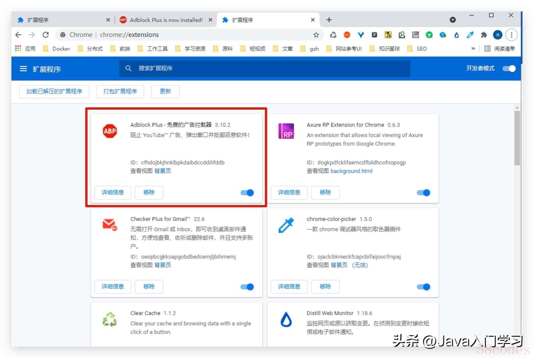 安装完成后,在 chrome 浏览器的扩展程序管理界面,查看当前已安装的 Chrome 插件列表,即可看到刚刚安装的 Adblock Plus 广告拦截插件已经显示在安装列表中了,这表示该插件已经安装成功了。