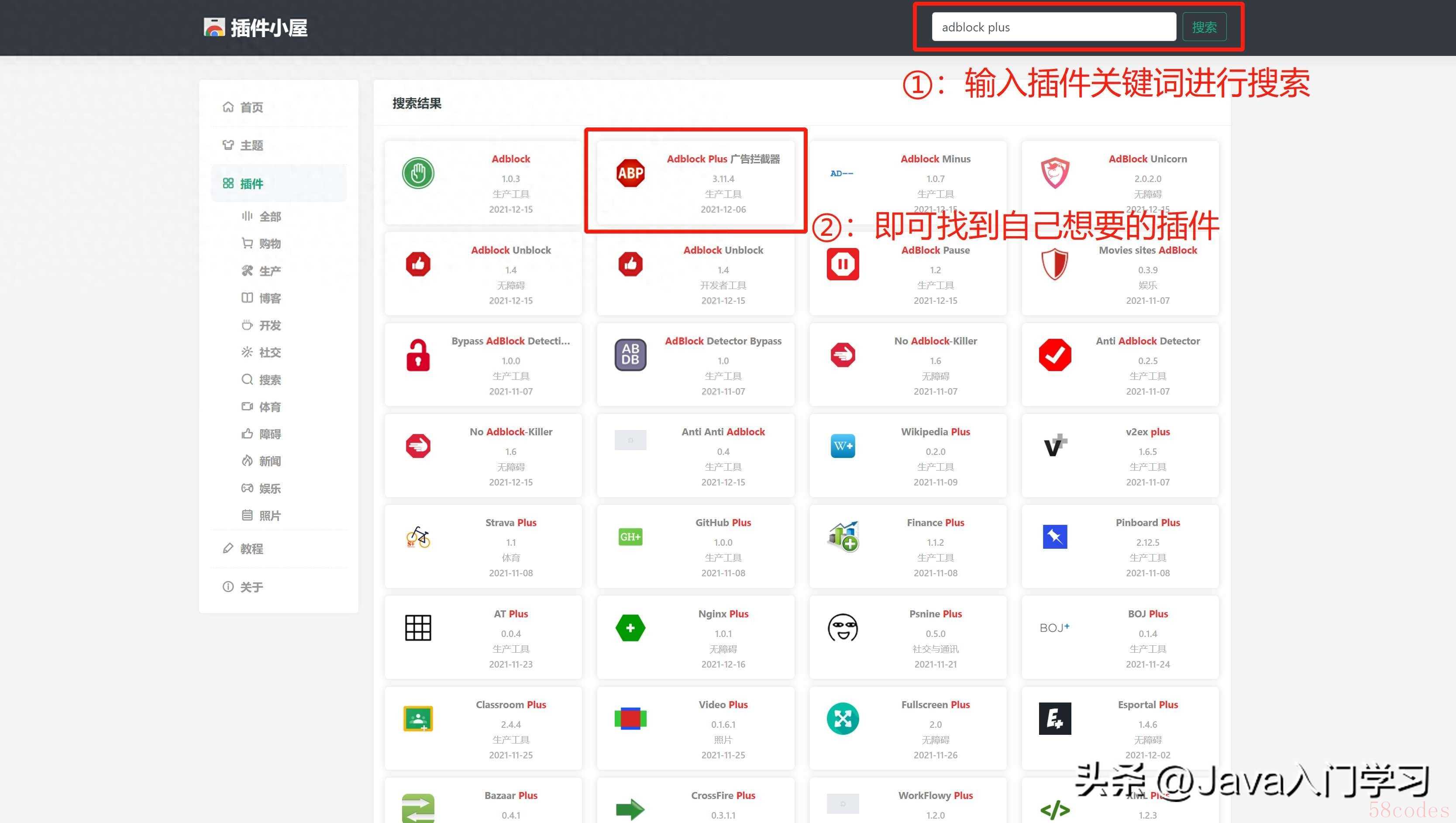 比如我想要下载安装 Adblock Plus 广告拦截器 这款插件,只需在搜索栏输入插件关键词,然后点击搜索即可: