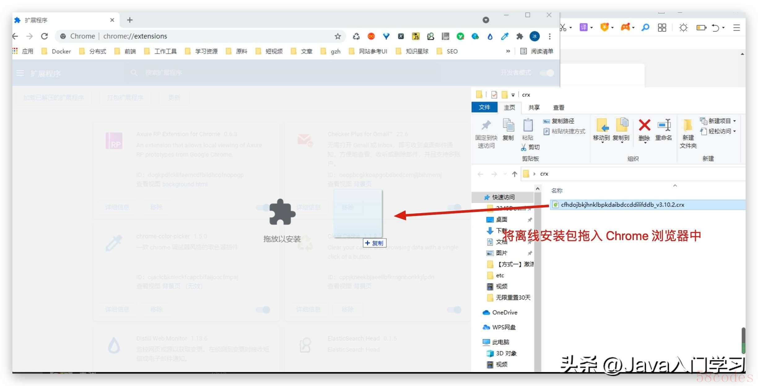将 .crx 安装包直接拖入 Chrome 浏览器中,即可完成安装: