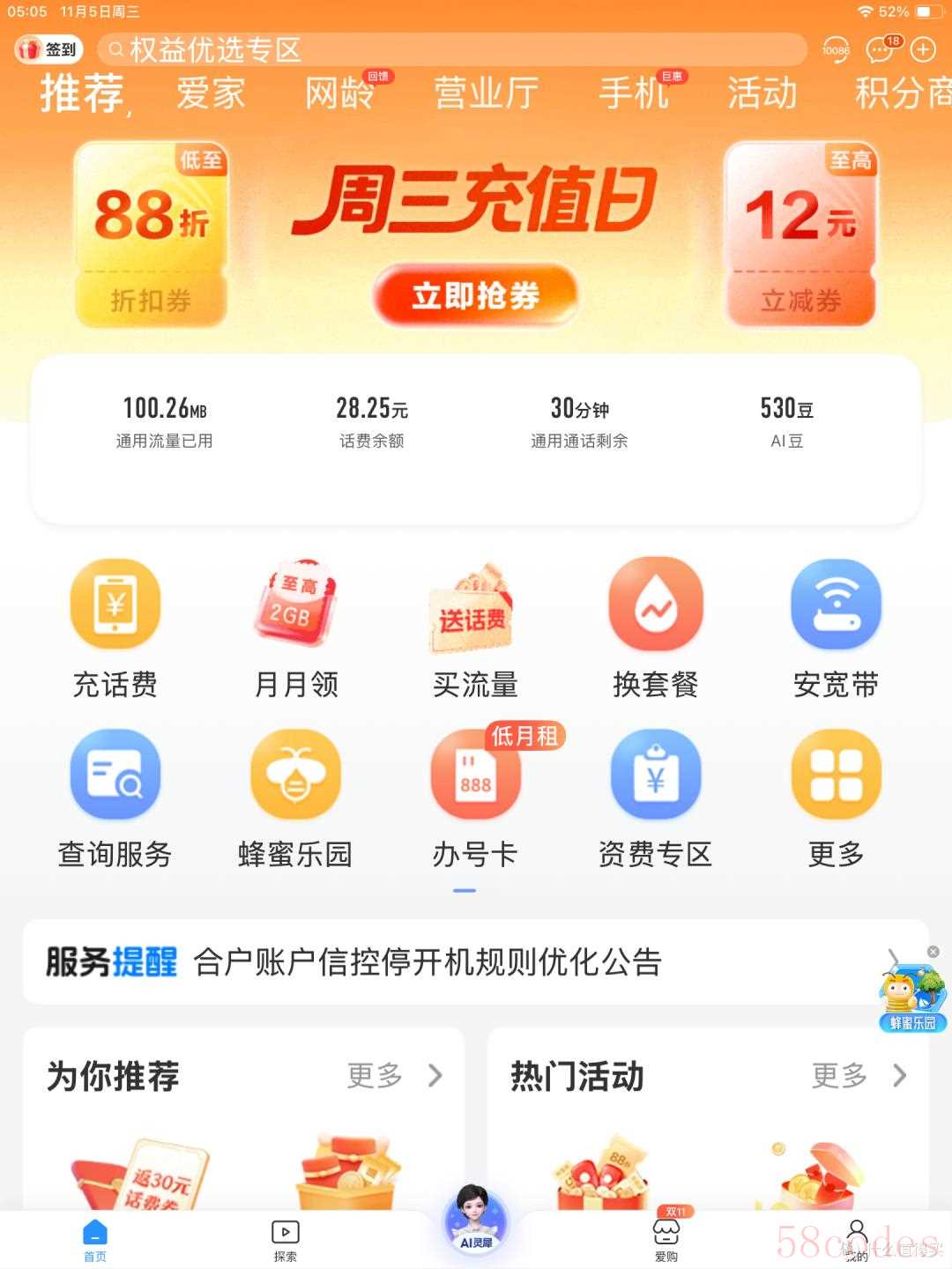 3、用 AI 豆抵扣:每年会赠 500AI 豆(100 豆抵 1 元),刚好抵扣 5 元,最终一年宽带 + 手机套餐约 98 元。