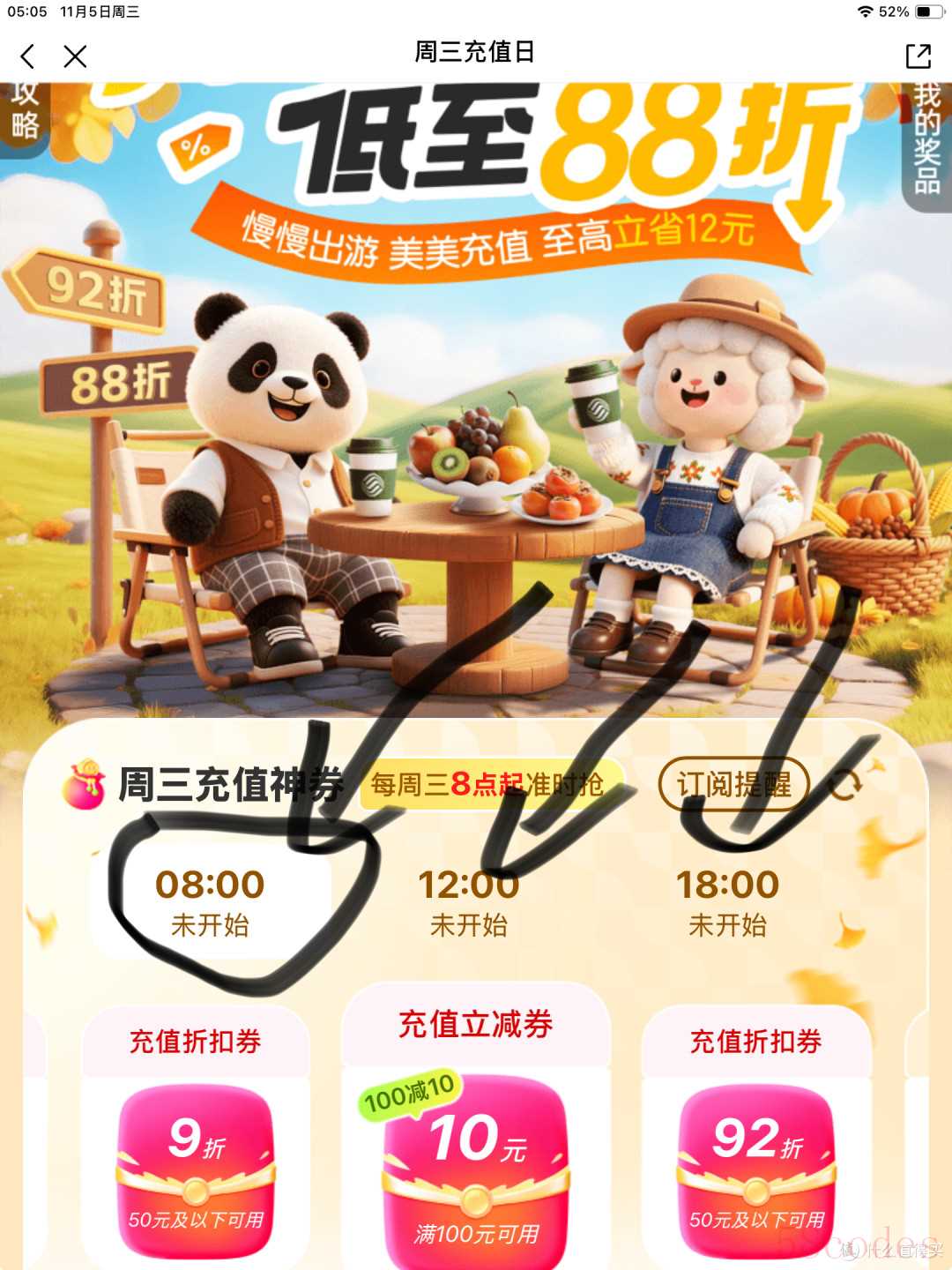 2、用 88 折 + 满减券:移动每周三有 88 折缴费券,再叠加 50 减 6 券,一次充 50 元,充 4 次 + 补 30 元,全年话费 + 宽带费更便宜;这是移动用户,我没有联通、电信,不知道有没有优惠券。