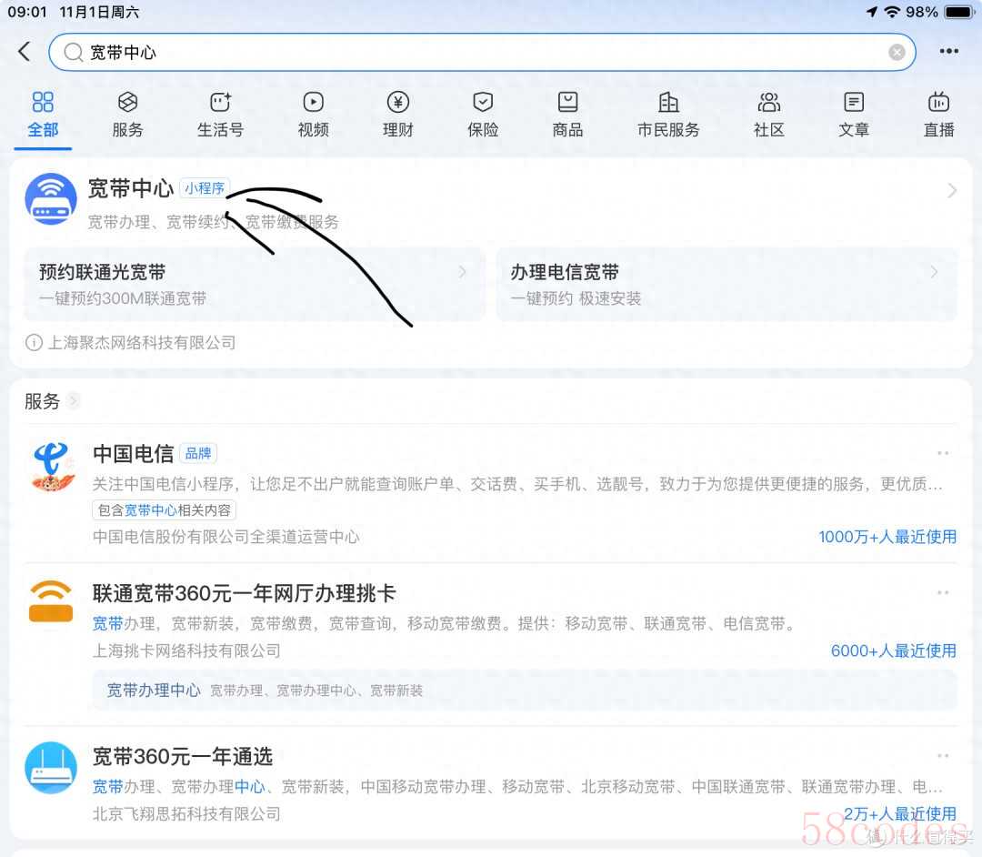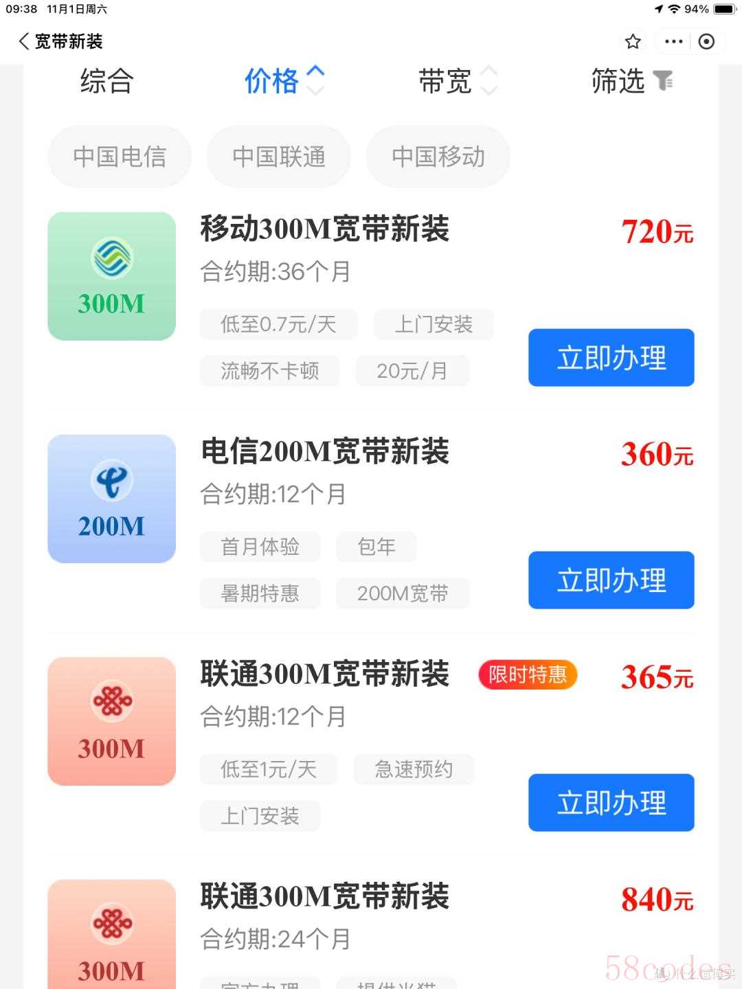 预约后会有专属客服联系,把之前的聊天记录发给对方,明确要求办理 “10 元 100 兆宽带” ;如果真的争取不到低价套餐,就是不给办,那只能去支付宝找“宽带中心”,在这里可以看到3大运营商的价格,如果没有低价再看后面介绍的其他方法。