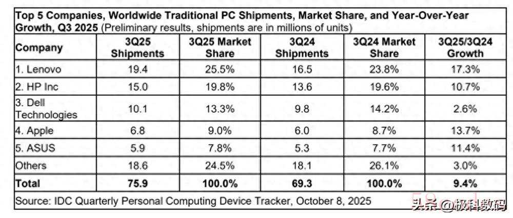 在2025年全球PC市场的激烈竞争中,联想以实力证明了自己的领导地位。根据国际数据公司(IDC)最新发布的《全球季度个人计算设备追踪报告》,2025年第三季度联想以25.5%的全球市场份额稳居第一。