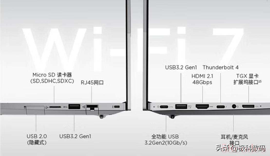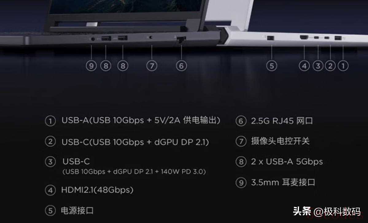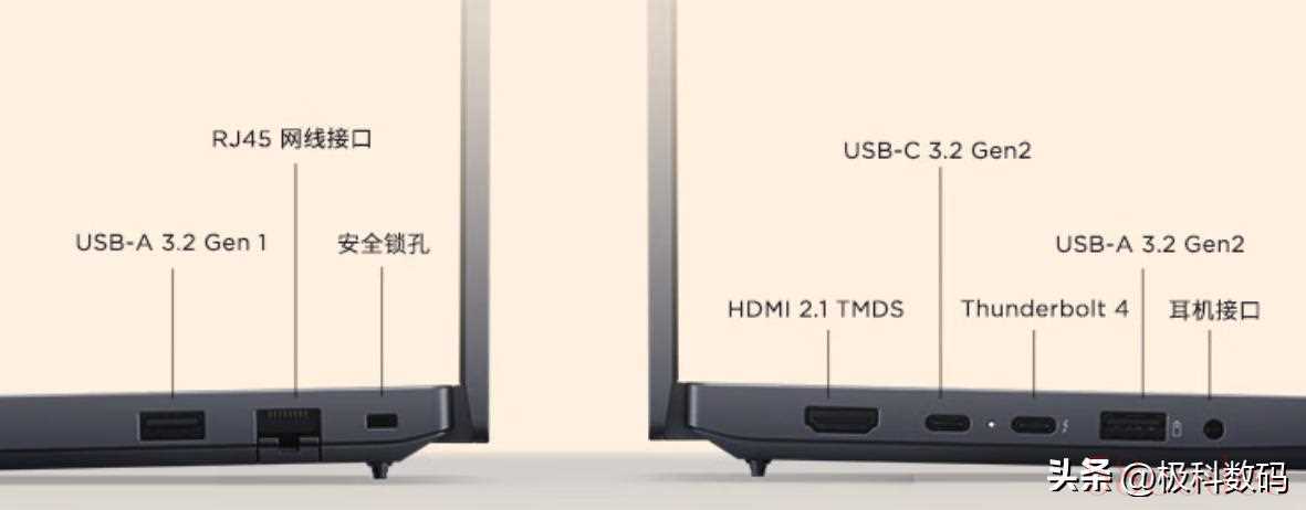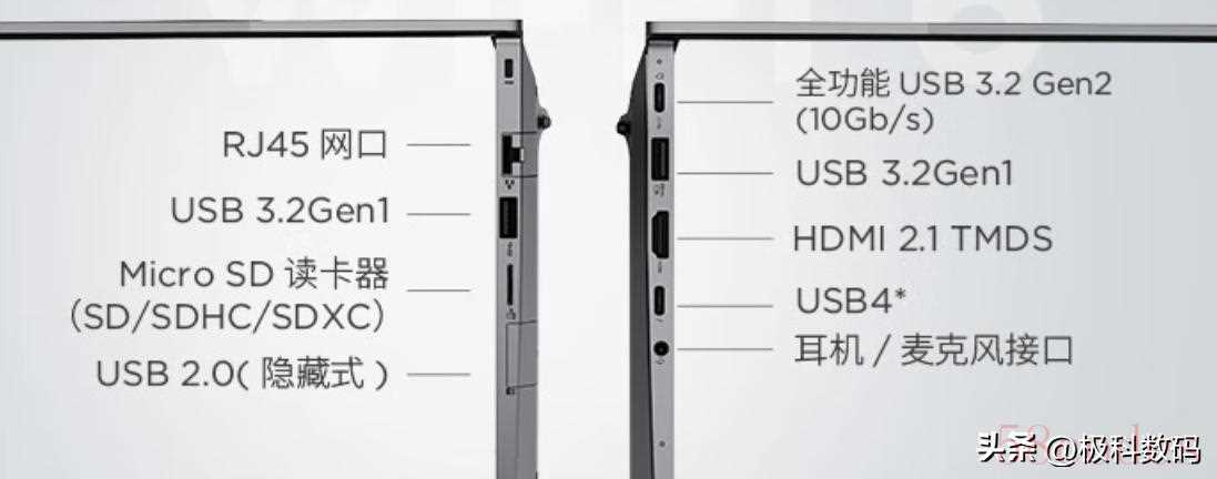 1x全功能 USB-C 3.2 Gen2(10Gb/s),1xUSB4,2xUSB 3.2Gen1,1xHDMI 2.1,1xMicro SD读卡器,1x隐藏式USB-A(USB2.0),1x耳机/麦克风接口,1xRJ5网口。