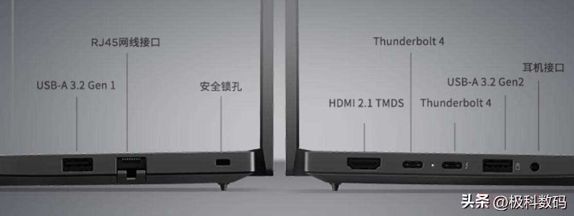 2x雷电接口,2xUSB-A 3.2Gen1,1xHDMI 2.1 48Gbps接口,1xSDXC UHS-I,1x3.5mm音频接口。