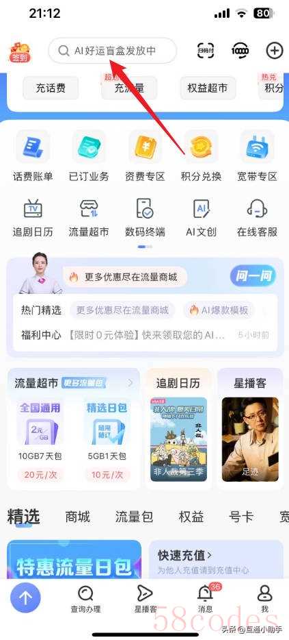 1、在苹果手机上打开中国电信APP,进入到首页,点击“搜索框”。
