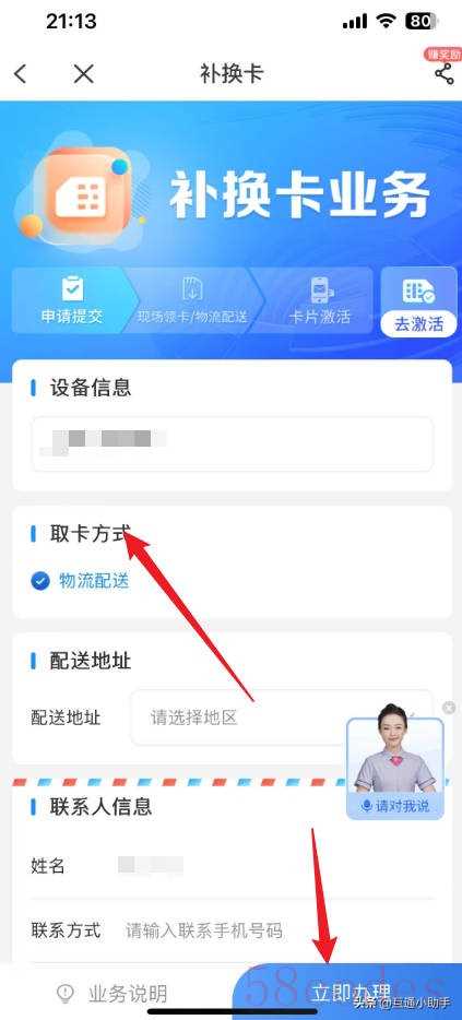3、进入到补换卡页面,输入设备信息、配送地址、联系人信息,点击“立即办理”。