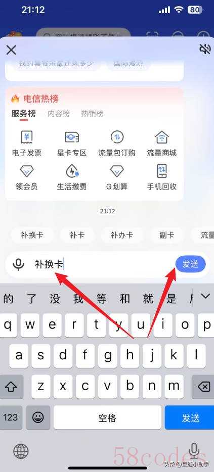 2、进入到搜索页面,在搜索框中输入“补换卡”,点击“发送”,等待AI客服经理跳转。