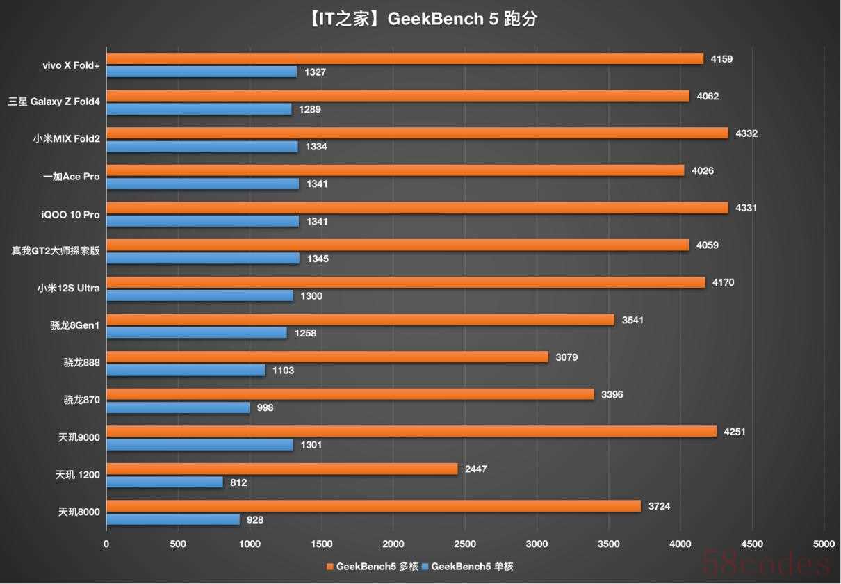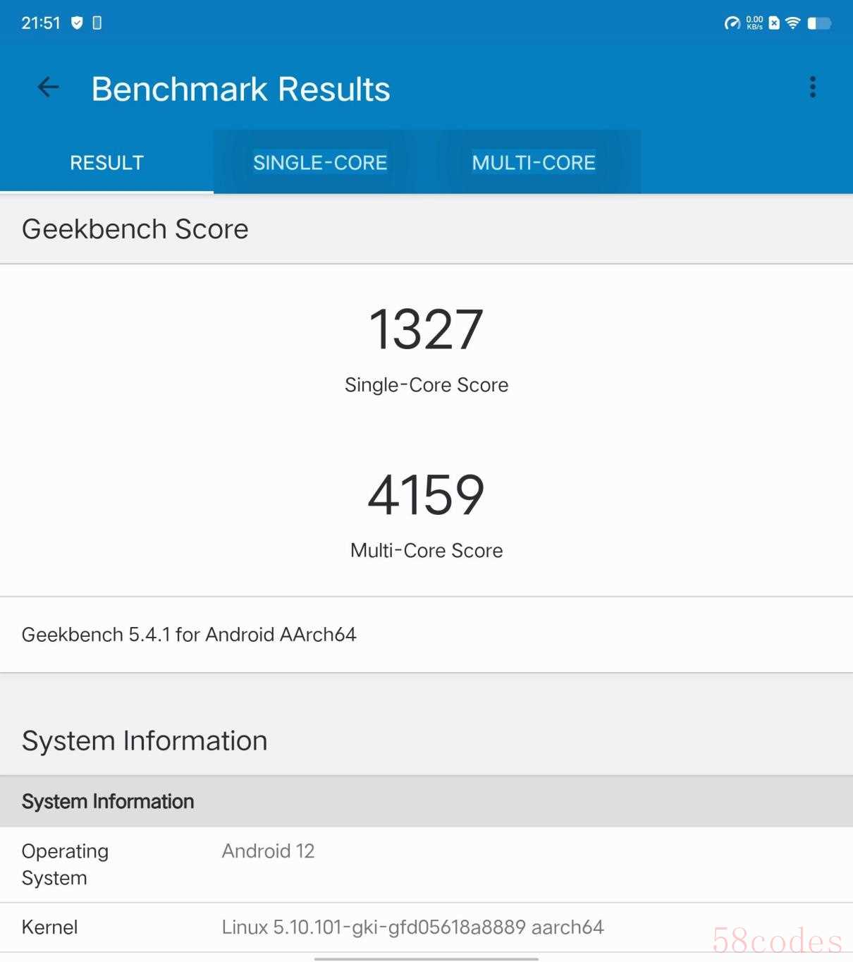 更侧重 CPU 理论性能的 GeekBench5 ,vivo X Fold+ 单核为 1327 分,多核达到了 4159 分: