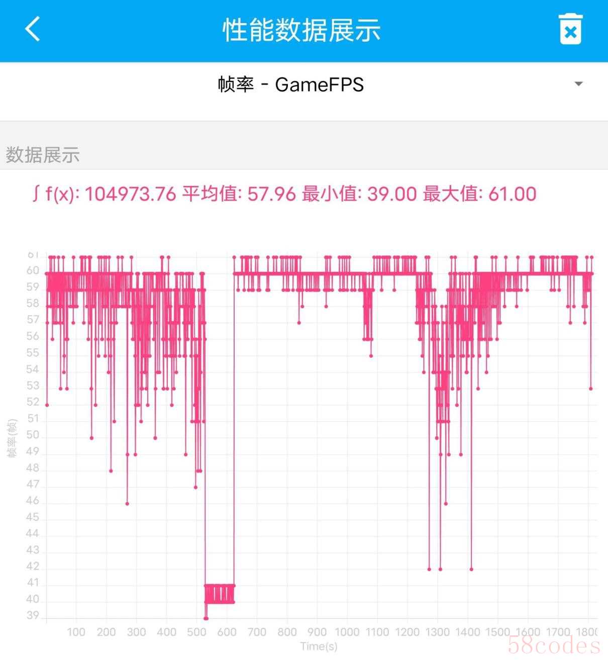 (原神画质设置如上)如下图所示,30 分钟游戏,vivo X Fold+ 的平均帧率达到了 57.96fps,游戏全程最低帧为 39fps,其余时间基本维持在 50-60fps 上下,后期包括战斗场景,游戏全程尚未出现锁帧降频现象,整体表现要明显优于骁龙 8 旗舰(同样测试条件,部分骁龙 8 机型帧率仅能够维持在 40fps 左右)。