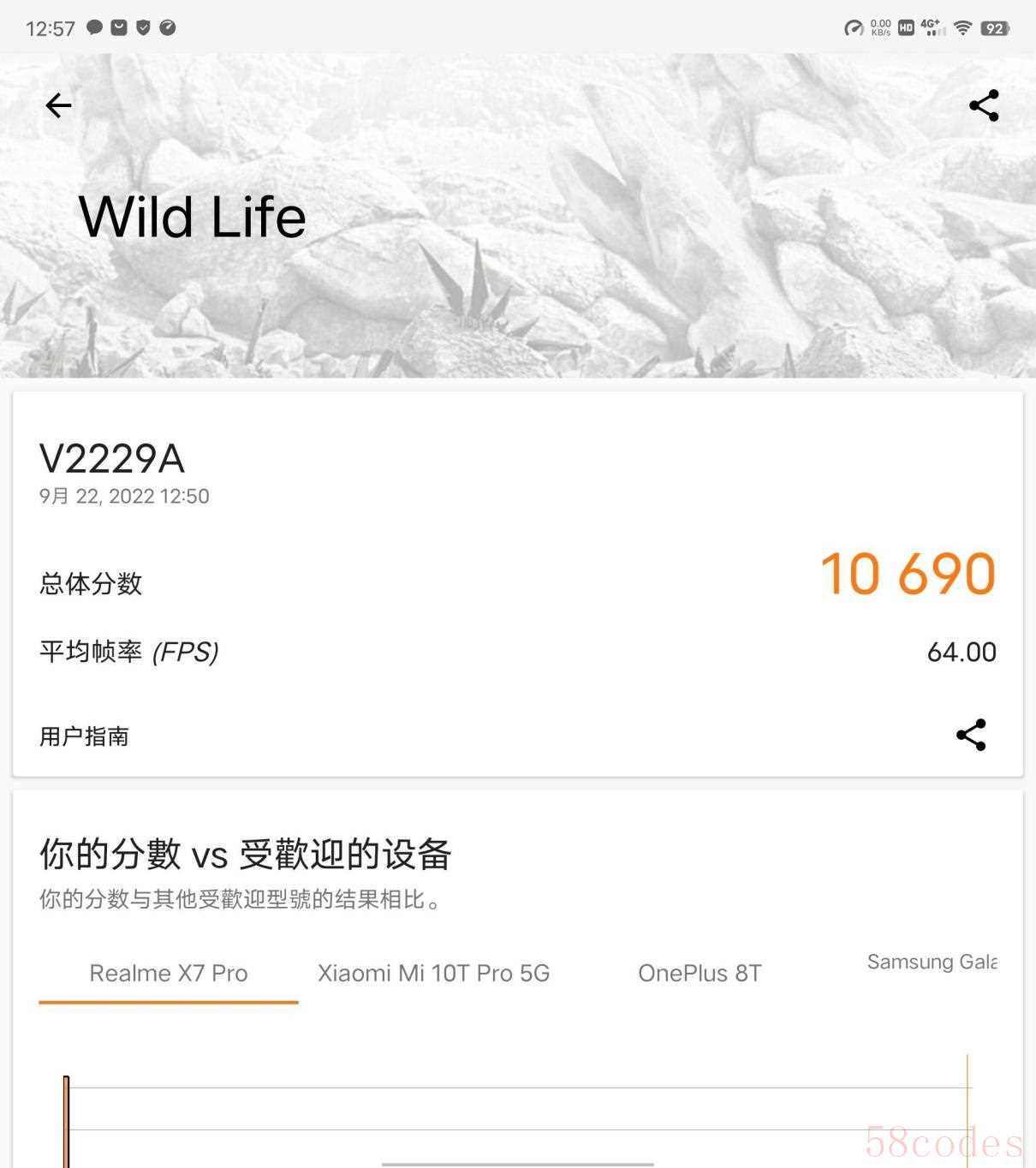 更侧重 GPU 理论性能的 3D Mark,在 Wild Life 测试项目中,vivo X Fold+ 总分 10690,其中平均帧率为 64fps,目前安卓阵营的顶级表现: