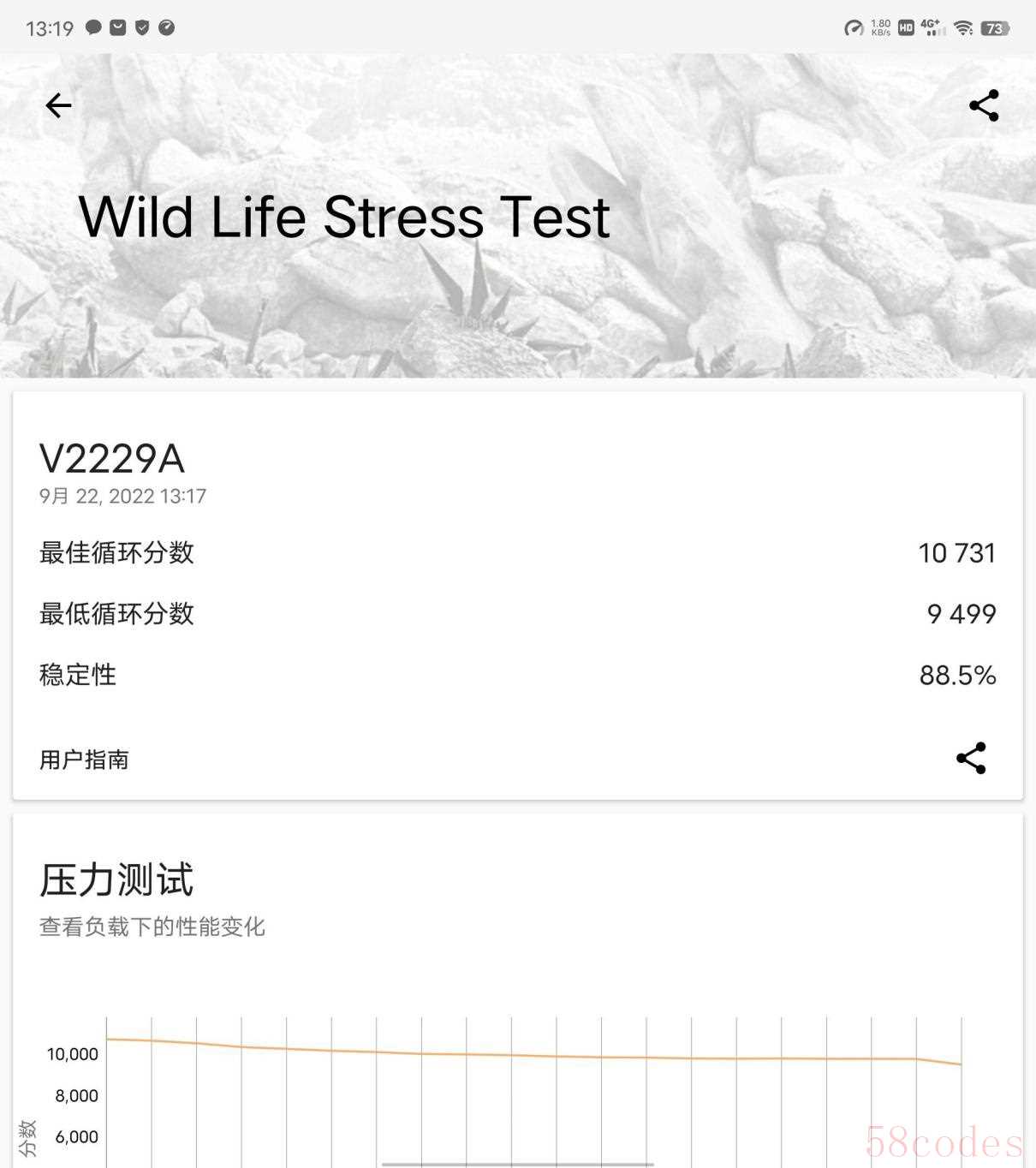 3DMark 的 Wild Life Stress Test 项目中,vivo X Fold+ 获得了 88.5% 的稳定性。相较于上一代骁龙 8(70+%)的成绩,骁龙 8 + 表现确实有明显提升,这也证明了,骁龙 8 + 更为出色的能效比,能够带来更为持久、温度的性能释放。