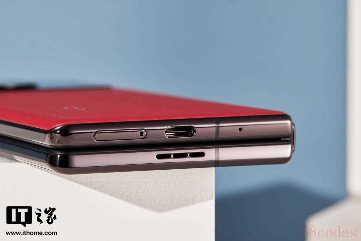 机身顶部,有硕大的扬声器开孔,以及红外线;机身底部,则是麦克风、扬声器、SIM 卡槽以及充电口;此外,vivo X Fold+ 共有三颗麦克风 (顶部 + 底部 + 背后镜头组),以及气压计,可在指南针中实时显示气压和海拔。