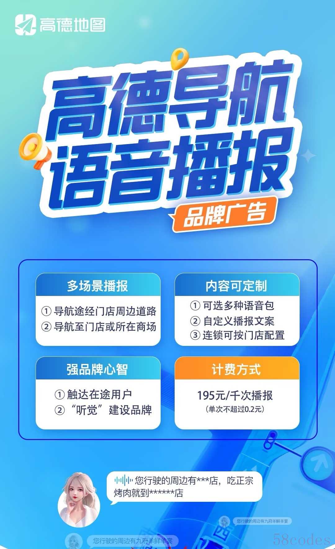 相比于直接转化的搜索推荐广告,导航语音广告主要侧重品牌曝光。上述服务商说道,高德导航语音包广告,价格为每千次曝光195元,2万元起投,单次成本不足0.2元,适合连锁品牌;而高德餐饮CPC广告(每点击付费广告)的售价为单次点击1.5元-3元,主要做具体门店转化。