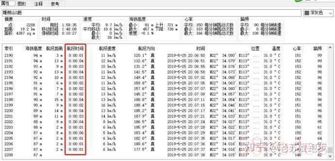 KML轨迹文件导入奥维后,可以看到有2208个轨迹点track point,那记录间隔为6552/2208=2.967,差不多平均3秒记录一次,这跟案例1不一样。 - Garmin BaceCamp分析