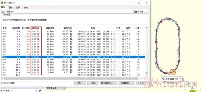 KML轨迹文件导入奥维后,可以看到有945个轨迹点track point,那记录间隔为2013/945=2.13,差不多平23秒记录一次,这跟前面2个情况也不一样。