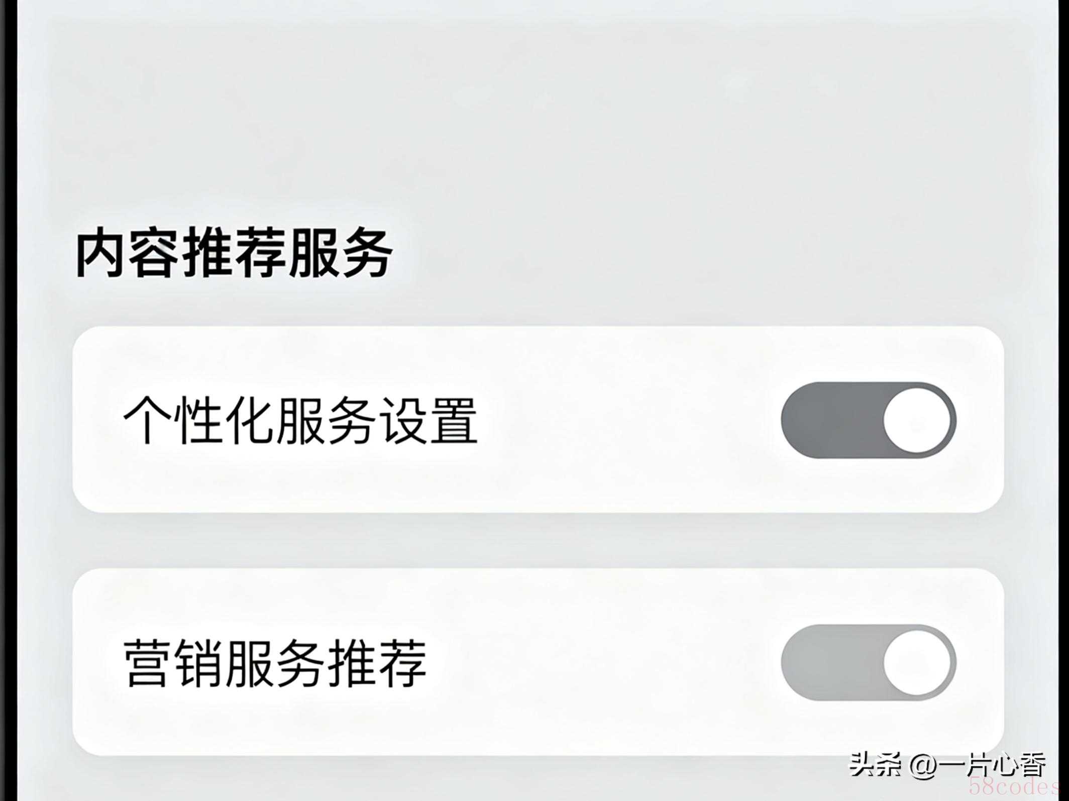 操作路径:打开【应用市场】→点击【我的】→右上角【设置】→【内容推荐服务】→关掉【个性化服务设置】和【营销服务推荐】。
