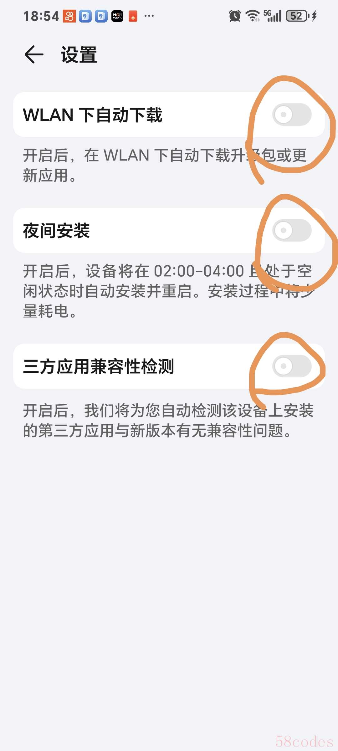 2把“WiFi下自动下载”“夜间安装”“三方兼容检测”三个开关全关了。