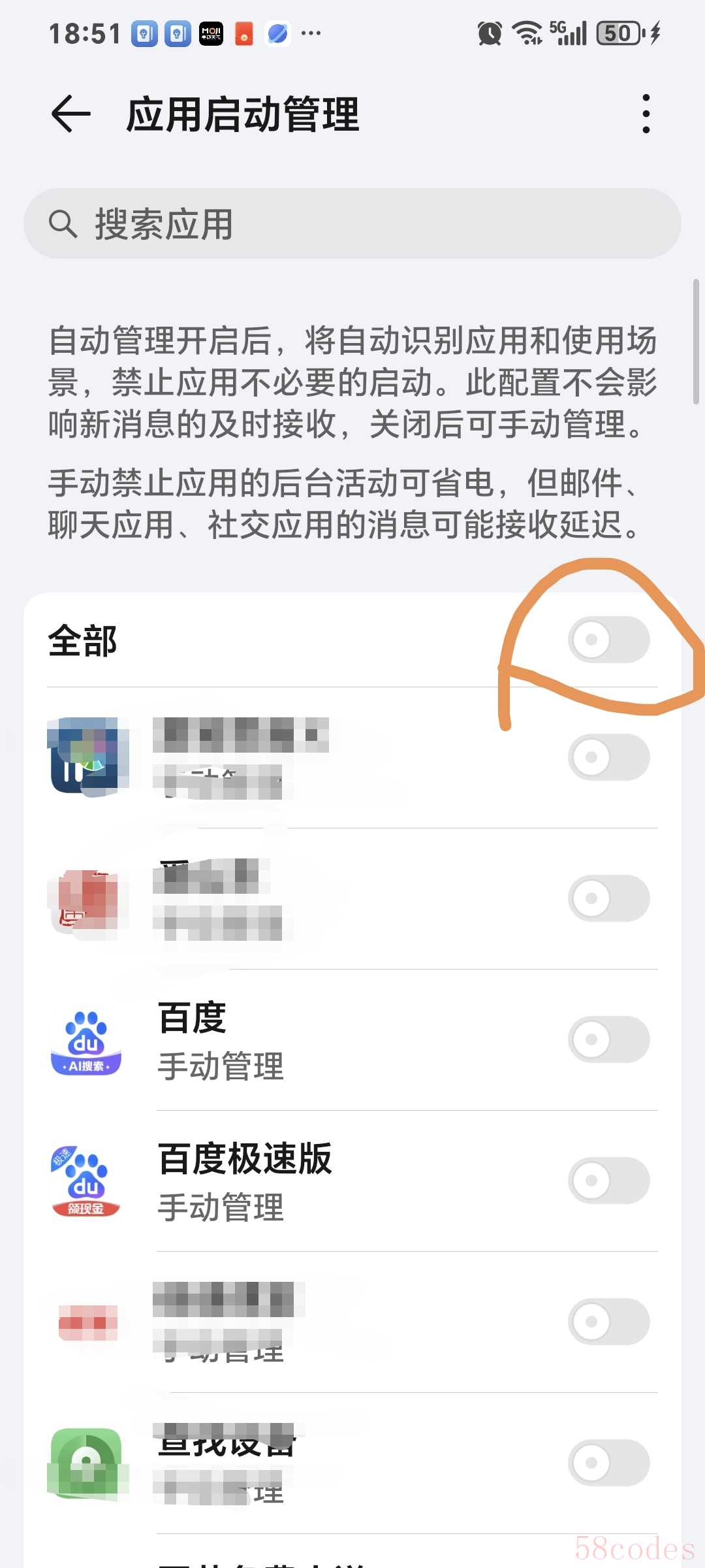 进入【应用启动管理】页面。刚买的手机默认所有APP都能“自启动”,几十款软件后台偷偷运行,手机能不发热、不卡顿吗?先点击“全部关闭”,然后只手动开启微信、支付宝、电话、短信这4-5个常用软件。