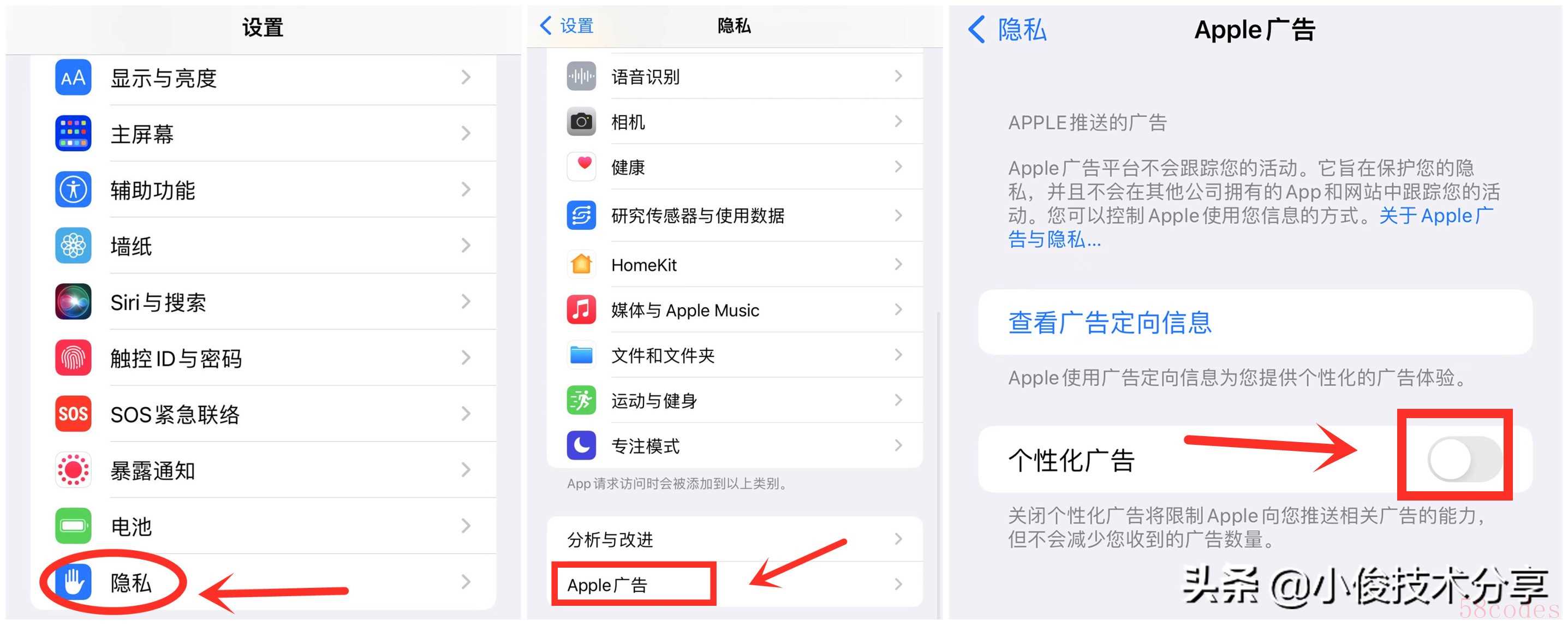 我们打开苹果手机的设置,然后点击【隐私】,在【隐私设置】页面直接往下找到【Apple广告】打开,打开之后直接把【个性化广告】开关关掉!
