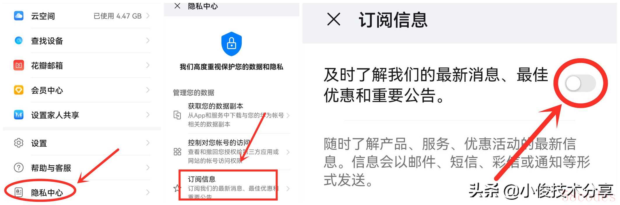 第二个要关闭的呢就是隐私设置中的【订阅信息】,那么我们首先呢需要打开设置,然后点击进入【个人中心】,接着选择【隐私中心】,打开【隐私中心】之后,把【订阅信息】开关关掉就可以了!