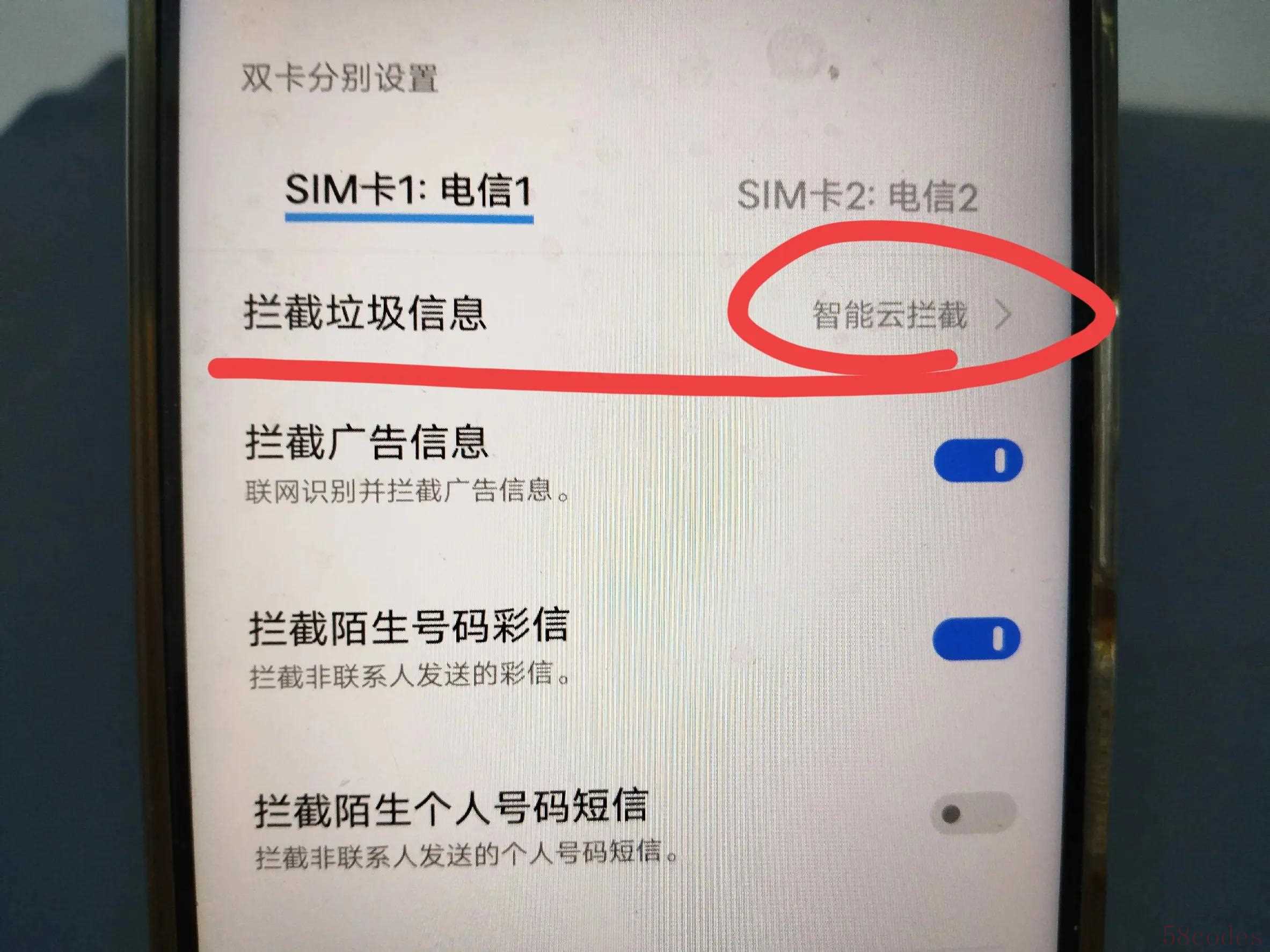 一定要打开这个智能拦截开关,这样就能联网识别并拦截广告信息,并把拦截广告信息打开,就可以避免了短信广告的骚扰(如上图所示)