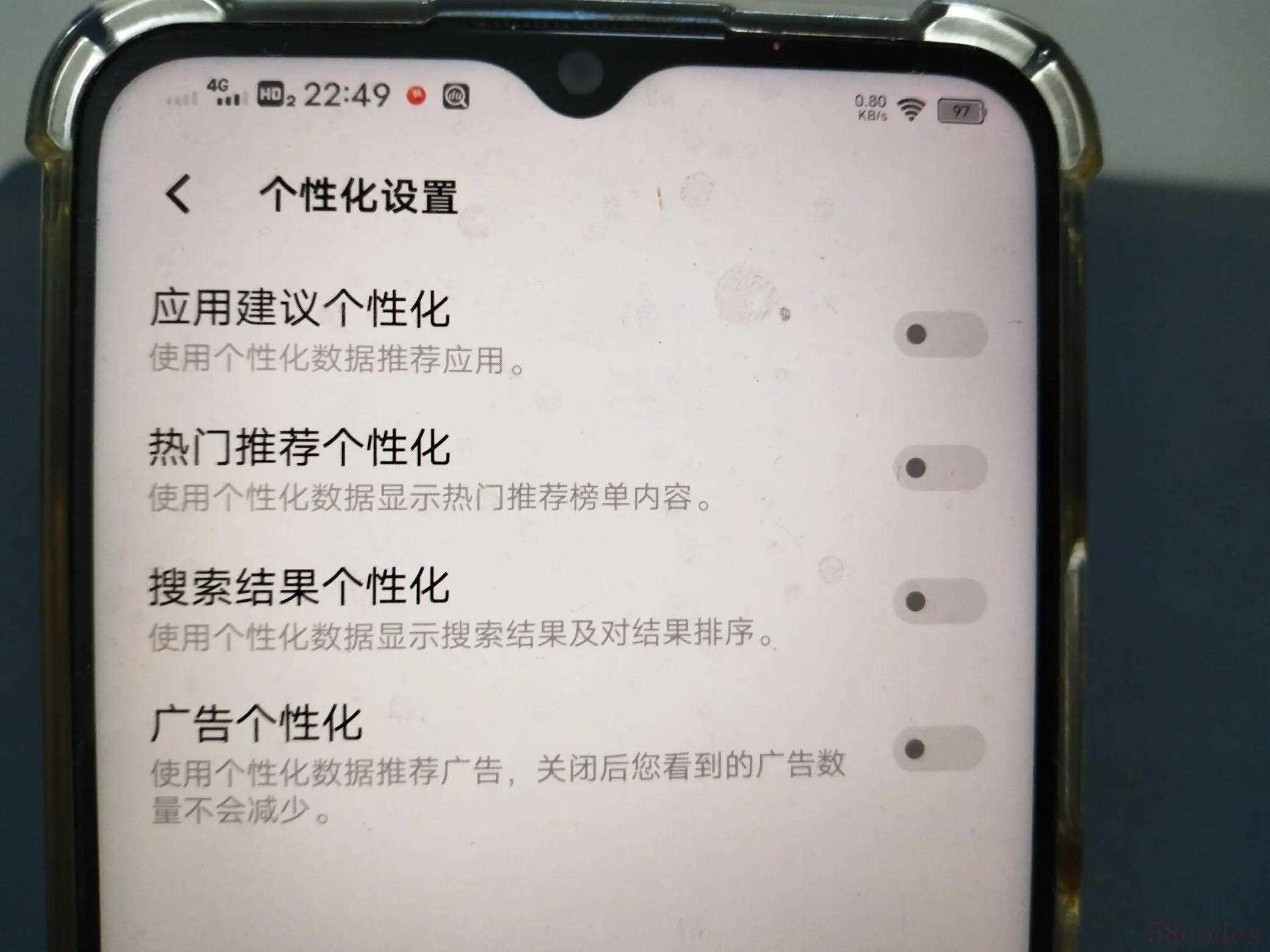 先打开广告个性化管理,一定要关闭应用建议个性化、热门推荐个性化、搜索结果个性化、广告个性化。关闭这些开关虽不能彻底关闭手机弹窗广告,但能防止个人信息被手机监听。(如上图所示)
