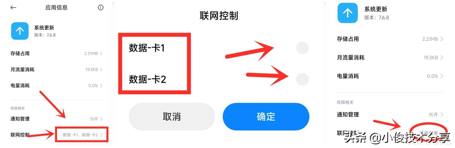 接着选择【系统更新】,打开之后将【联网控制】开关点击打开,然后把【数据1】和【数据2】这2个选项都关闭!