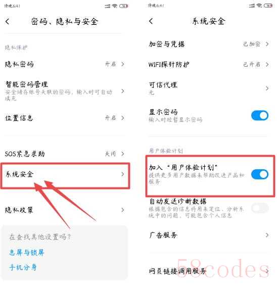 关闭方法:打开【设置】--【密码、隐私与安全】--【系统安全】--关闭【加入“用户体验计划”】。
