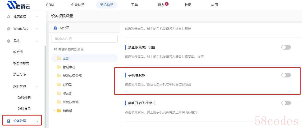 具体操作特别好记,就两步:登录工作手机的后台管理系统在首页找 到手机助手——设备管理板块,点进去就能看到 “手机号脱敏” 的开关按钮,直接把开关拨到 “开启” 状态就行,不用填复杂参数,几十秒就能弄完。
