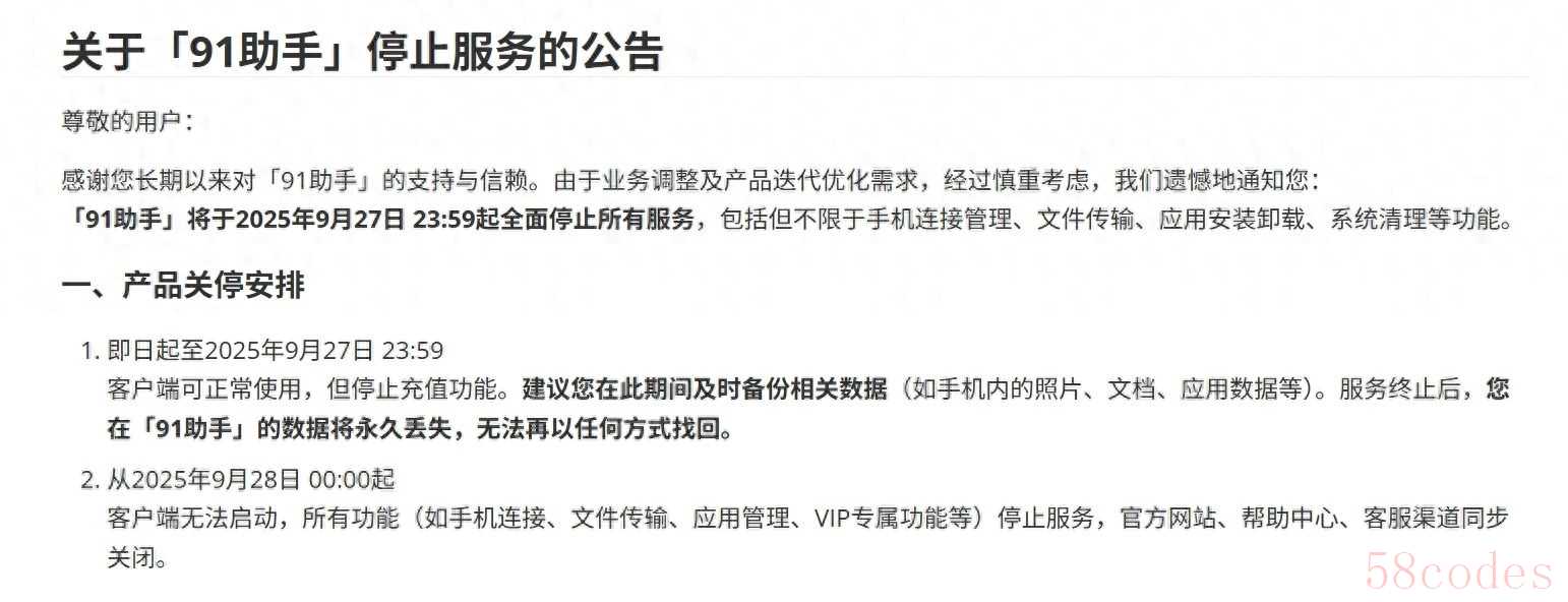 9月28日消息,曾广为人知苹果、安卓设备管理工具“91助手”现已全面终止所有服务。