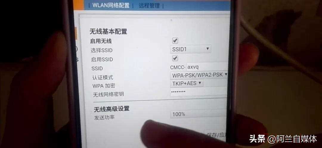我们把上面的“网络”点开,点开网络后我们往左滑动,注意看下方有一个“无线高级设置”,下方的发送频率是100,我是已经设置了的!