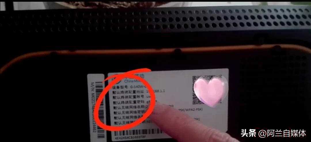 首先我们拿出我们的光猫,把它翻过去,注意看背面,在这里有无线网络的名称,还有我们网络密码、钥匙都在这里,都是写的很清楚的,注意看上方还有一个默认的终端配置地址是192.168.1.1。下面还有默认的终端配置账号,默认的终端配置密码。我是中国移动的光猫,无论你是移动还是电信还是联通的方法都是一样的!