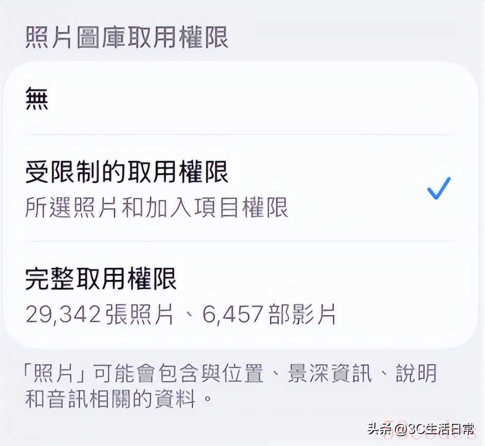 - 每个 App 可选择【仅限所选照片】或【拒绝访问】