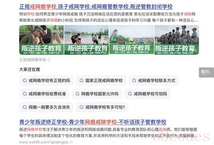 百度搜索“戒网瘾学校”,排名靠前的多是学校官网