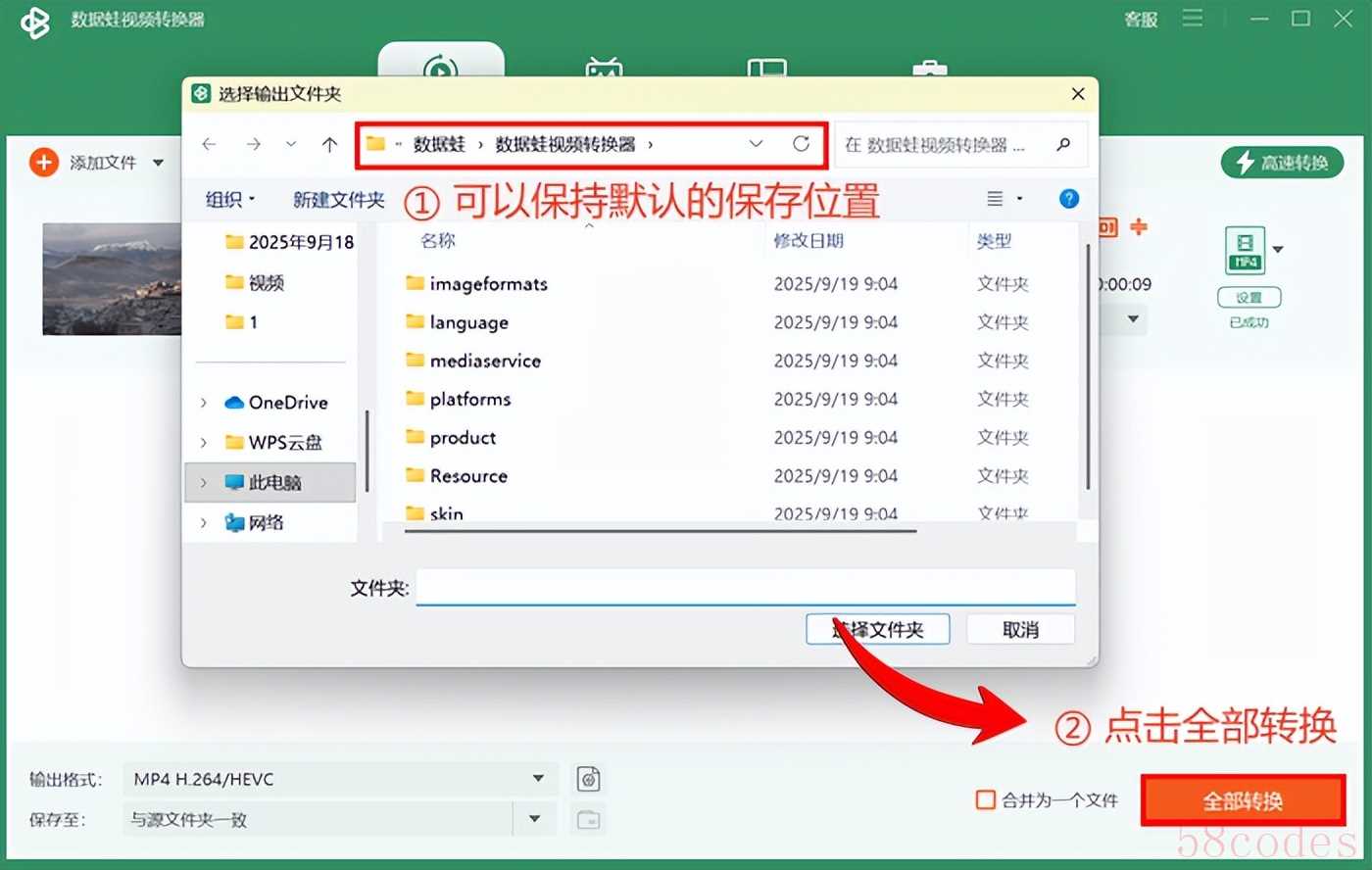 第三步:最后,为即将进行视频格式转换的文件选择保存路径,点击右下角的全部转换按键,稍作等待即可。