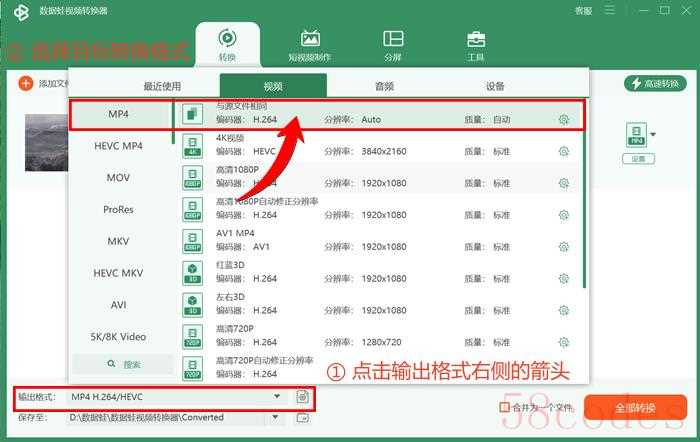 第二步:看到左下角的两个关键选项,用户首先要做的就是选择输出格式,一般默认选项就是MP4格式,这种情况则无需调整。