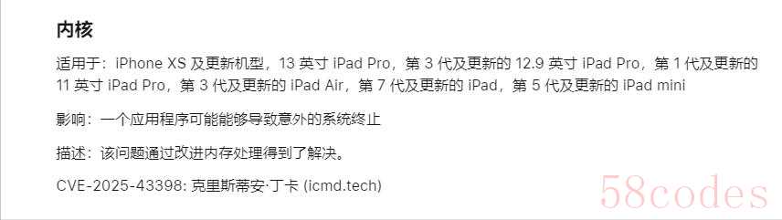 从 iOS 18 到 iOS 26 全部沾边。也就是说,苹果不补不行,补了也不会给你任何“性能提升”这种好消息。