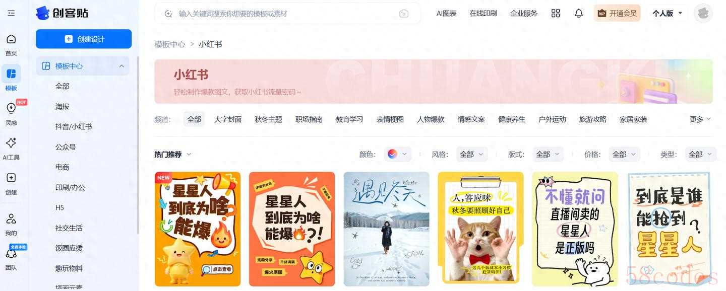创客贴就是这样一款能够完美解决小红书封面的设计神器。它以简洁直观的操作界面、丰富多样的设计模板和强大的智能设计功能,让每个人都能轻松成为设计大师。无论你是设计小白还是专业设计师,无论你是个人用户还是企业用户,创客贴都能为你提供一站式创意设计解决方案。