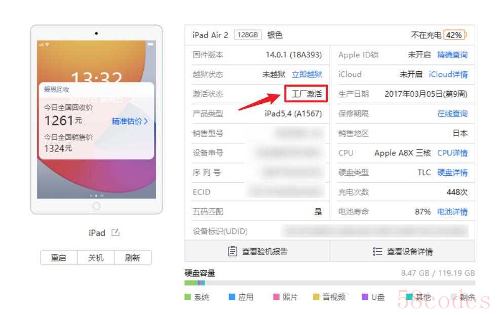 GSX 能查到这台设备的具体激活时间、具体型号规格、是否为官换机、有无 ID 锁等等信息。
