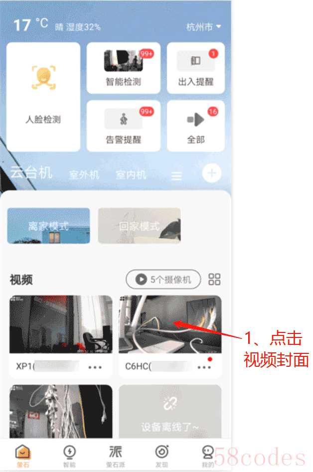 1、登录萤石云视频手机APP,在“萤石”页签,点击设备视频封面,输入密码(默认为摄像机验证码);