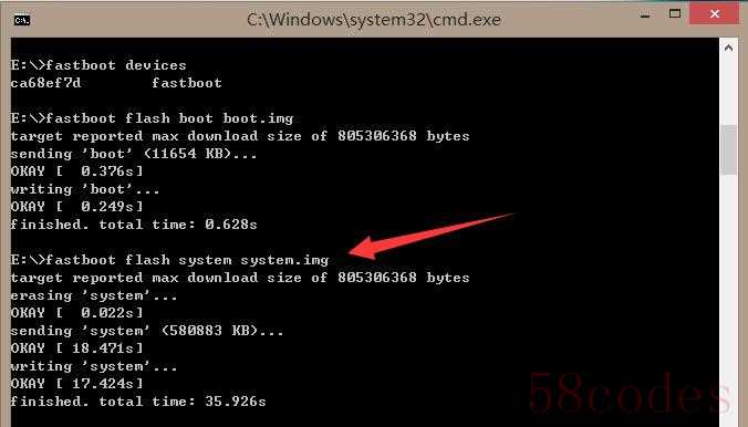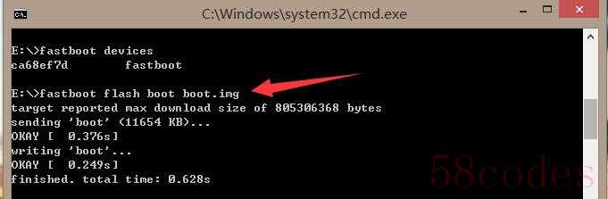 ③上文说的,复制fastboot.img、boot.img、recover.img、system.img这四个文件,这里就要用来刷机救砖了!键入fastboot flash boot boot.img并回车,看到finished表示刷入boot.img成功;