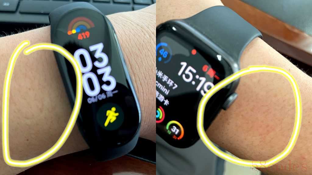一、就外观来说,小米手环7虽然比前代的屏幕大了一些,但是椭圆形的米粒设计确实不如Apple Watch更漂亮。但是在实际的佩戴过程中会发现,Apple Watch由于表盘过大、传感器过大,相应的与皮肤的接触面也更大一些,冬天没有什么感觉,但是到了夏天,出汗后就会引发一些皮肤方面的问题。