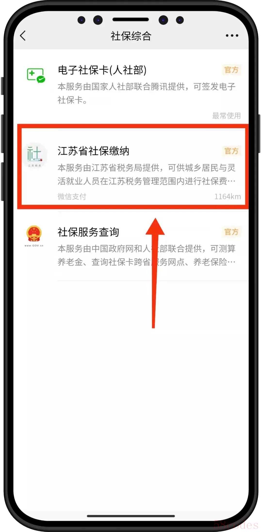 从微信的支付页面进入“城市服务”,选择自己所在的城市,点击“社保综合”,选择“江苏省社保缴纳”,通过实名认证后,点击“缴费”即可。